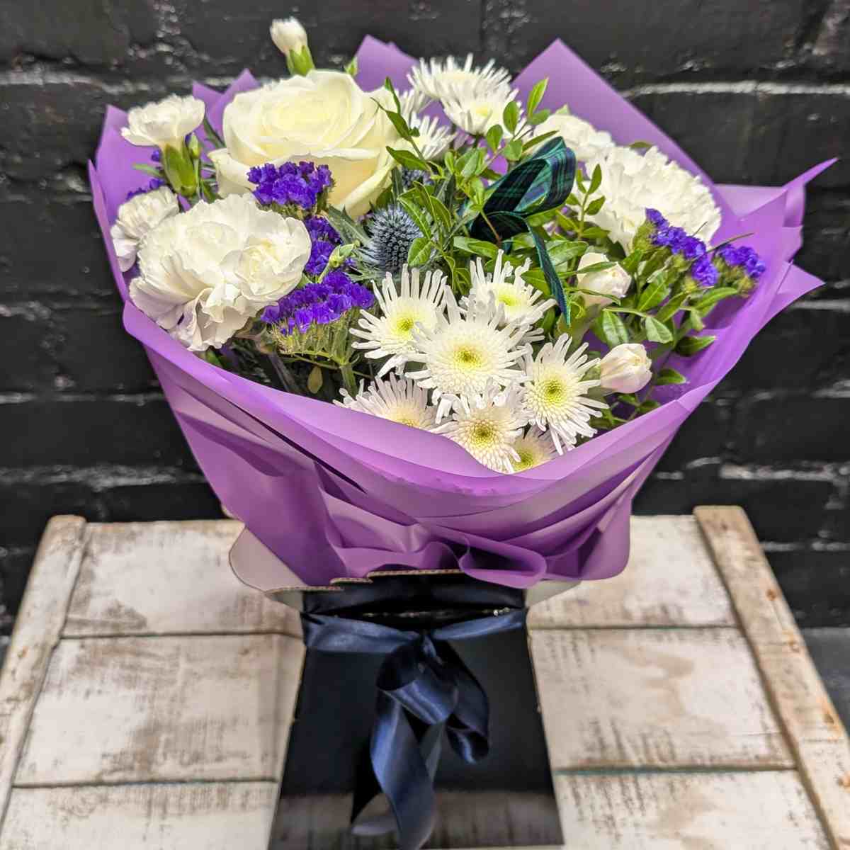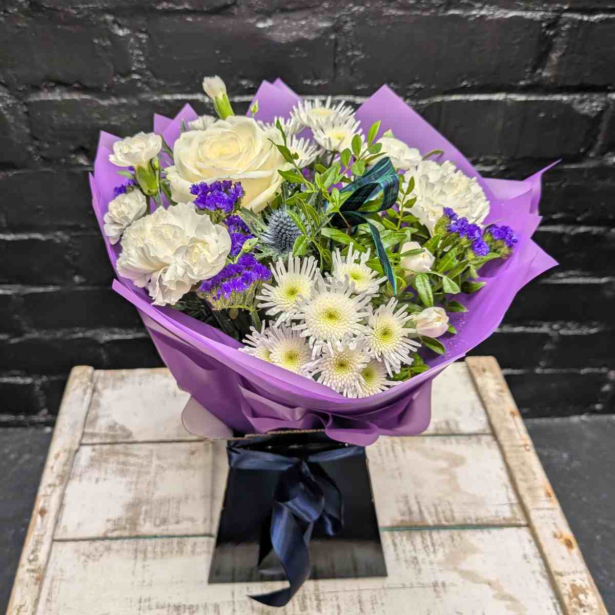 The Serenity Bouquet is a perfect blend of classic beauty and vibrant charm. Featuring a stunning white rose as its centerpiece, it’s beautifully complemented by a mix of delicate white chrysanthemums and charming white carnations. The deep purple accents from the sea holly and other filler flowers add a touch of sophistication, making this arrangement truly stand out.